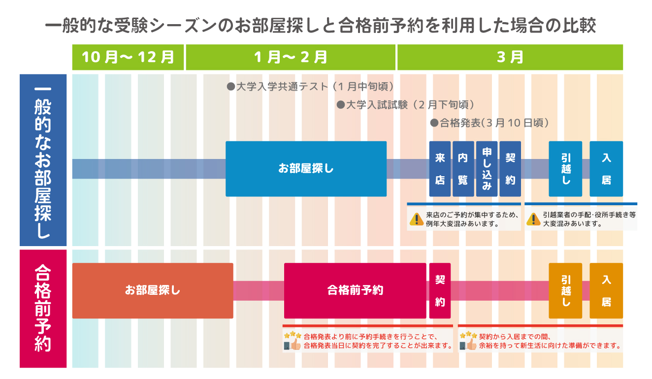 合格発表の結果を待ってからお部屋探しを始めるのが、一般的な受験シーズンのお部屋探しです。しかし、合格発表(3月10日ごろ)から入学式まで準備に費やせる時間は1ヶ月程度しかありません。
