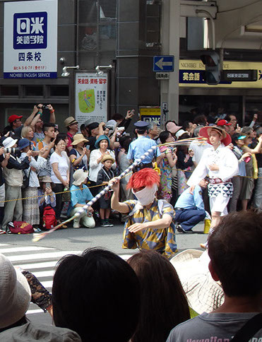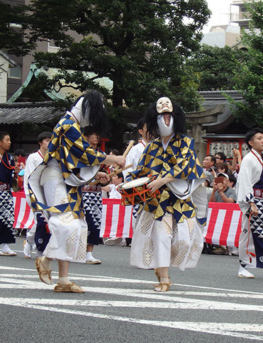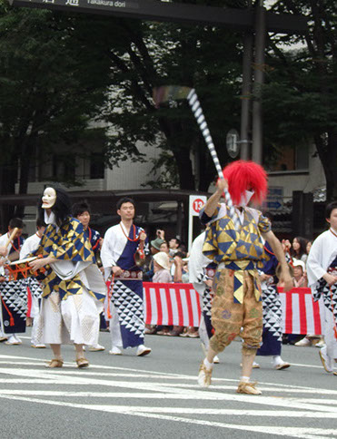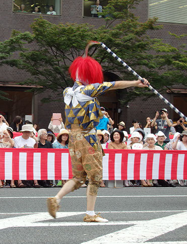 綾傘鉾の特徴である棒振り囃子は、赤熊(しゃぐま)のかぶり面をつけた棒振りと、鬼面をつけた太鼓を持つ者とバチを持つ者が、鉦と笛に合わせ疫病退散の踊りをおこないます。