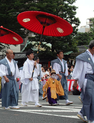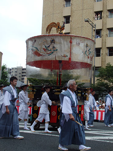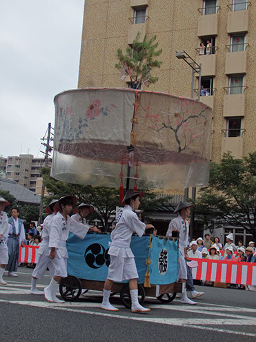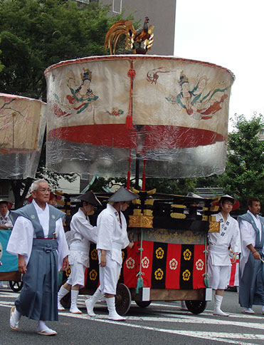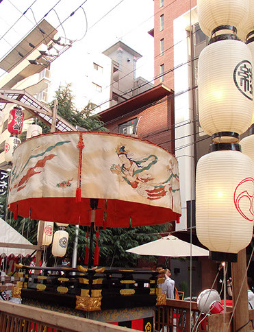今宮神社のやすらい祭に似て、王朝の古式を今に伝える鉾です。鉾の形も、台車の上に大きな傘を載せた古い形態を残しています。公家風の装束姿の6人も稚児も巡行に参加します。2つの大傘を持ち、ひとつは森口華弘作の友禅染物傘で、もうひとつの織物の垂(さが)りをつけた傘上に御神体と金幣を飾っています。