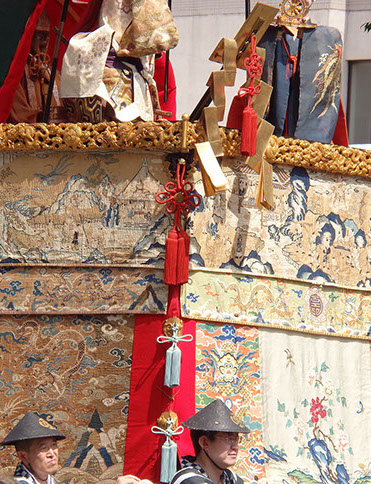 台を取り巻く襴縁は、2.7メートル×2.16メートルと山鉾の中でも随一の長さです。胴懸、前懸の下に見える轅(ながえ)も6メートルと、舁山の中で最も長いです。