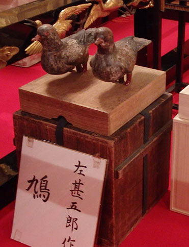 山の上に八幡宮を勧請しています。総金箔の小祠は天明年間(1781―88)に制作され、欄縁の彫金「飛鶴」は、天保9(1838)年工芸家河原林秀興の周作です。朱塗りの鳥居の笠木に向かい合う白鳩は左甚五郎の木彫りと言われています。鳩は雌雄の対になっており、夫婦和合の意味を持ちます。
