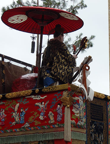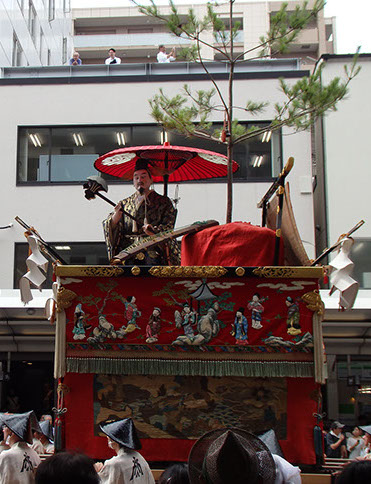 ところが、当山保存会長の杉本秀太郎氏によれば、現在の御神体の装束(正装)や「断り」に通じる「琴割り」の音から、もうひとつの故事が主題になっているのではないかと言います。それは、「戴逵破琴(たいきはきん)」という話で、諸芸の達人だった戴逵が、武陵王の召し出しを断るあt目に、使者の目の前で琴を割ったというものです。