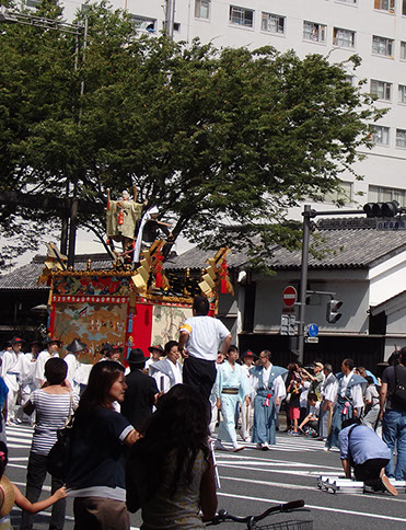 前懸は富岡鉄斎の原画「椿石霊鳥図」、胴懸の綴綿「加茂葵祭行列図」は円山応挙の下絵と伝えられています。山にも真松も朱傘も山籠もなく、古来の形をいまに伝えています。山上で対峙する御神体は、まわり舞台のごとく四方どこから眺めても迫力みなぎります。古来くじ取らずの山です。