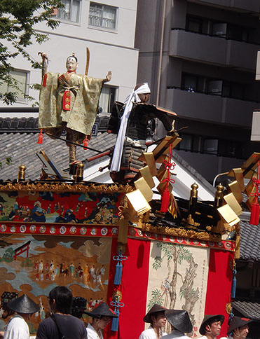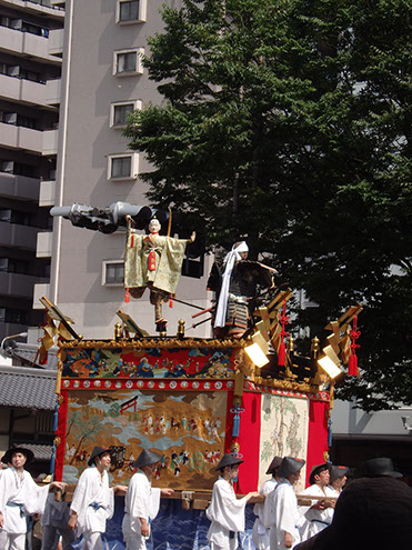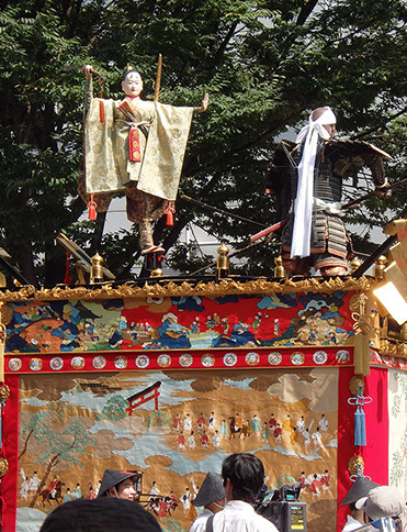 巡行時には揺れの激しい山上で、牛若丸像は絶妙なバランスを保っています。橋の擬宝珠(ぎぼうし)の尖端に、左足の足駄(高下駄のこと)の前歯のみで立っているのです。左脛(すね)から肩まで心木(しんぎ)が通り、さらに脛から踵(かかと)、次に足の甲を通り抜けて前歯へと通っています。心木は何段階にも別れ、その複雑な構造は先人の知恵によるものです。