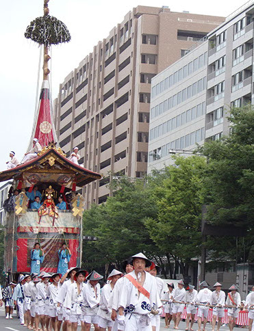 連日会所は、夕暮れから二階囃子が鳴り響きますが、宵山の締めくくりは、「日和神楽」です。午後10時ごろ二階囃子の後に、巡行の無事を願って、四条寺町の御旅所まで屋台に金を釣り、お囃子を奏でながら参詣します。夜半、四条通りは熱気に満ち盛り上がります。