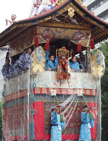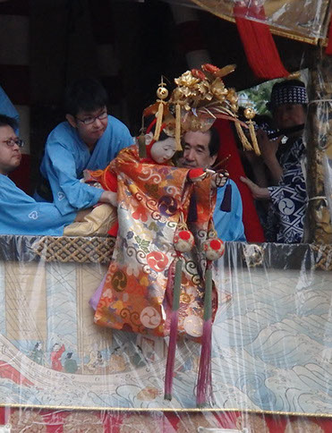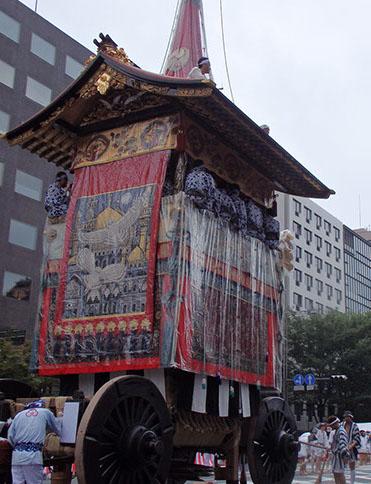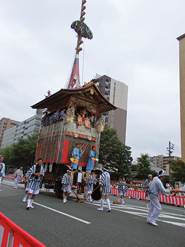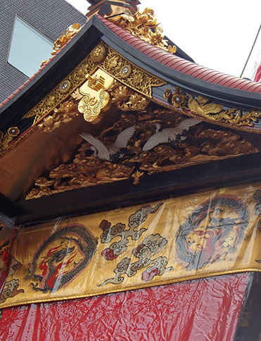 昔は生身の稚児でしたが、昭和4年以降、稚児人形に代わり、巡行の際には3人の人形方によって稚児舞が披露されます。明治中期に鉾の大改装がなされ、破風正面「三羽の丹頂鶴」は四条円山派の画家・幸野楳嶺の下絵によるものです。