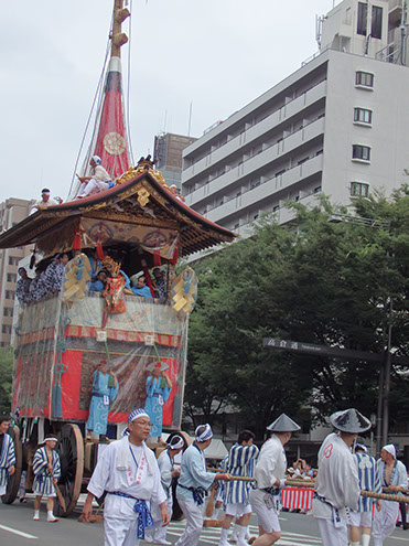 町角で芸を披露しながら仏法を説く放下僧(ほうかそう)を祀る鉾です。禅語で「放下(ほうげ)」といい、妄念を捨て、技芸練磨に専念することです。鉾頭は日、月、星の三光が下界を照らす形をしています。鉾頭が洲浜に似ているので別名「洲浜鉾」とも言われます。