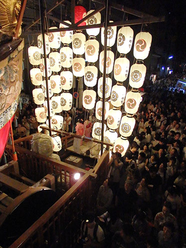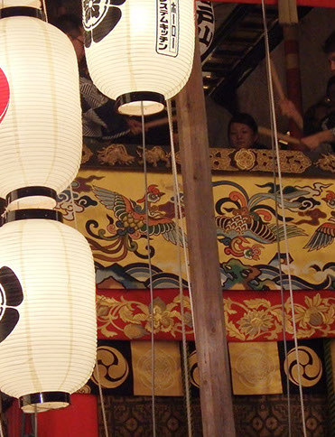 日本神話の「天の岩戸」と「国生み」を色濃く表した曳山です。天照大神(あまてらすおおみかみ)、手力男尊(たぢからおのみこと)、伊弉諾尊(いざなぎのみこと)と、3体のご神体が祀られています。巡行時には「くじ取らず」で、22番目を行きます。鳥居には長鳴鳥(鶏)が止まっています。