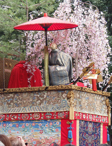 謡曲「志賀」により、歌人大伴黒主が桜花を仰ぎ見ている姿を表しています。御神体は寛政元年(1789)の作です。山に飾る桜の造花は、翌年の粽に添えられ、この桜を玄関に挿すと悪事除け、泥棒除けになるといわれています。