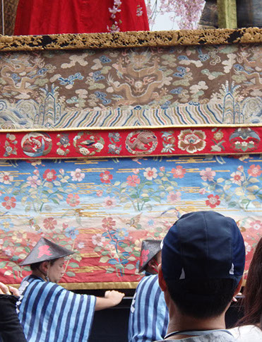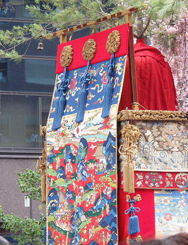 前懸は萬歴帝即位の折の御服と伝わる古錦を復元した「五爪龍文錦」です。近年、復元新調された見送は「牡丹双鳳凰文綴錦」、ほかに「紅地唐子遊図」もあります。