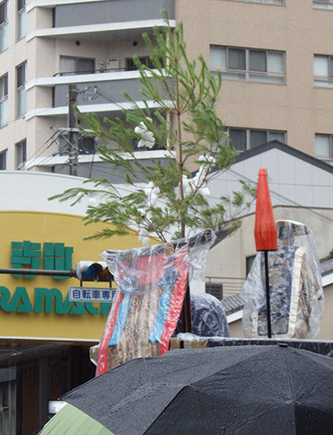 呉の国の孟宗が、病の母の大好物の筍を雪中の竹やぶで掘り当て、食した母の病が癒えた故事に由来しています。御神体は左手に鍬、右手に筍を持ち、喜んで帰っていく姿を表しています。筍などにつく雪が、夏の祭りにあってひときわ目を引きます。