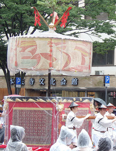 鉾の歴史は古いですが、明治5年には一旦巡行から姿を消しました。昭和60年に復活し、その3年後には巡行に参加し、棒振り踊りも再開しています。傘と若松全体を御神体とし、若松の足元には赤幣が添えられています。御幣は、通常金箔もしくは白が多い中で、赤幣のみというのは珍しいです。