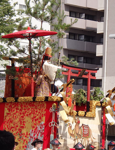 山鉾一の美女と言われる御神体人形は、完全な人間の形をしていて、頭(かしら)や手足を取り外すことは出来ません。しかも、巡行時の衣装は能装束なので、常着から着替えるのも大変な作業になります。装束つけを担当するのはプロの能楽師で、祇園祭の御神体の中では数少ない女性の神様でもあり、装束の下には安産祈願の腹帯も着けられています。