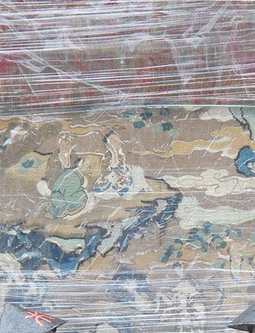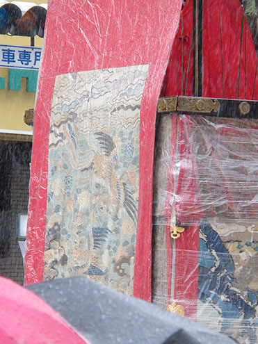 優れた懸装品をもつことでも知られ、特に、前懸「唐人市場交易図綴錦」、見送「鳳凰牡丹図綴錦」は、彩り豊かな逸品です。欄縁金具は金色の雲に蝙蝠をあしらったもので、夕暮れを表しています。